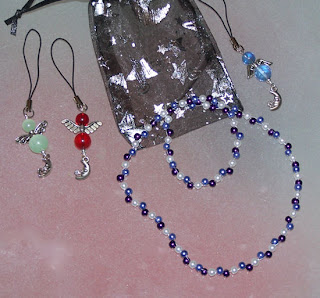 Sowie ein paar Schlüsselanhänger bzw. Taschenbaumler, sie sind jeweils inkl. Karabiner ca. 10 cm lang, die blauen Anhänger sind auf Schmuckdraht gefädelt, die grünen auf Nylon.